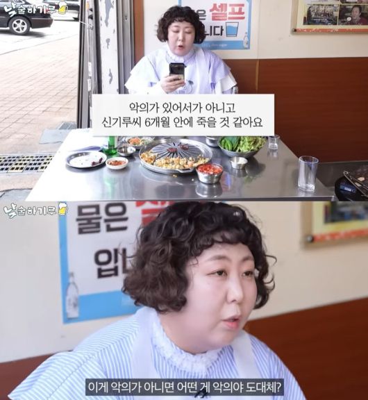 영상 속 신기루는 "그저께인가 DM(다이렉트 메시지)으로 '악의가 있어서가 아니고 신기루 씨 6개월 안에 죽을 것 같아요. 정말 걱정되는 마음으로 잠을 못 이루며 DM 보내요'라고 어떤 분이 보내셨다"고 알리면서 "너무 열받는다"고 분노했다.