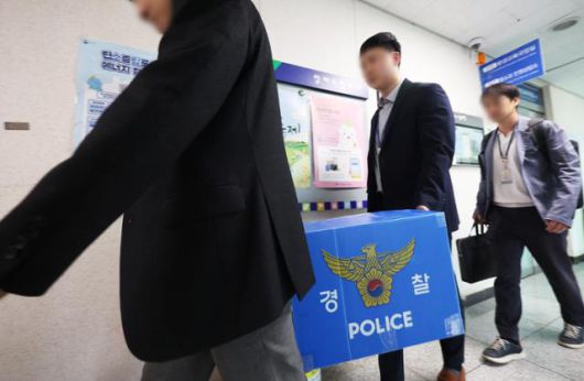 서울~양평 고속도로 노선 변경과 관련한 특혜 의혹을 수사 중인 경찰이 16일 경기 양평군청 압수수색을 마친 뒤 압수품을 옮기고 있다. 연합뉴스 |