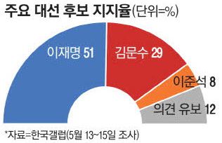 16일 공개된 한국갤럽의 13~15일 전국 18세 이상 1004명 대상 조사에 따르면 이재명 후보 지지율은 51%로 집계됐다. 직전 조사보다 13%포인트 상승하면서 한국갤럽 기준으로 처음 과반을 달성했다. 2위인 김 후보와 격차는 22%포인트다.