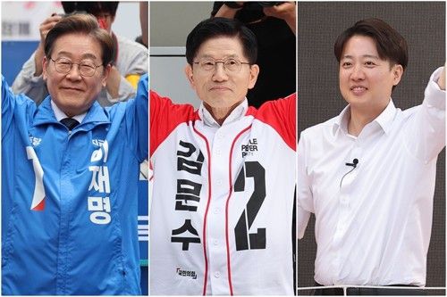 대구에서 집중유세하는 이재명 후보(왼쪽부터), 부산 자갈치 시장에서 유세하는 김문수 후보, 대구 2.28기념중앙공원에서 집중유세하는 이준석 후보. [사진 = 연합뉴스] |