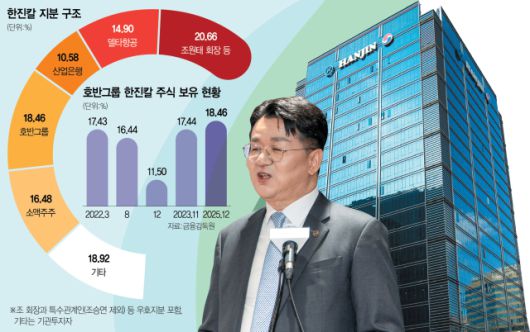 여기에 조 회장, 한진칼과 오랜 기간 공동사업을 이어온 델타항공(14.9%)의 지분까지 포함하면 호반과의 현실적인 지분 격차는 17.89%포인트에 달한다. 최악의 경우 산업은행(10.58%)이 지분 전량을 호반그룹에 매도해도 최대 지분은 29.04%로 조 회장 측과 델타항공(36.35%)과의 격차는 7.31%포인트다. 호반이 경영권을 위협하려면 약 488만 주 이상을 매수해야 한다. 이날 종가 기준 약 6000억 원의 자금이 추가로 필요한 격차다. 호반이 단기간에 경영권을 위협하기 어렵다는 관측이 나오는 이유다. 업계 관계자는 “호반이 한진칼의 경영권을 차지하려면 산업은행과 델타항공이 모두 호반 측에 서는 상황이 돼야 한다”며 “각자의 이해관계를 볼 때 현실적으로 가능성이 매우 낮은 시나리오”라고 설명했다.