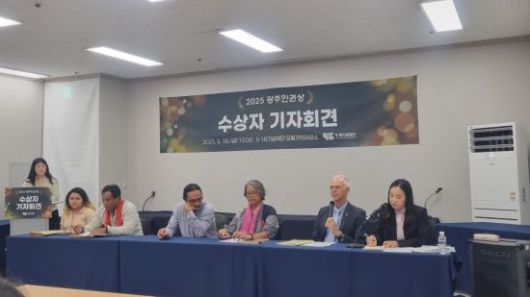 16일 오후 5·18기념재단 오월기억저장소에서 열린 2025 광주인권상 수상자 기자회견에는 본상을 받은 아시아 정의와 권리(AJAR) 패트릭 버지스 회장, 갈루 수자트모코 사무총장, 루이스 올리비에라 이사와 DKK 문화동맹 줄리어스 시저 바유바이 다기탄 부회장과 안젤라 라우손 홍보담당관 등이 참석했다.