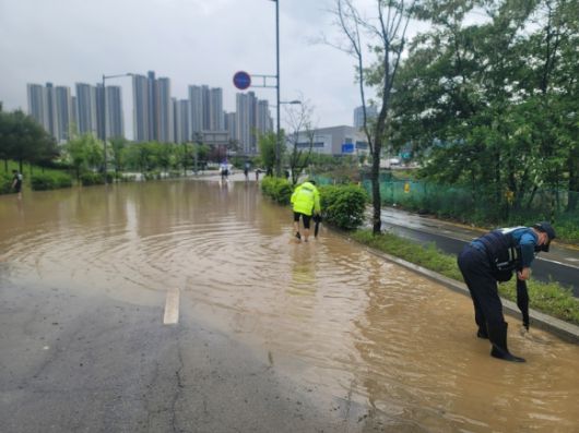 경기 양주시 옥정 호수공원 근처 도로가 갑자기 내린 비로 침수되자, 경찰이 차량통행을 금지하고 배수 작업을 하고 있다. [경기북부경찰청 제공] |