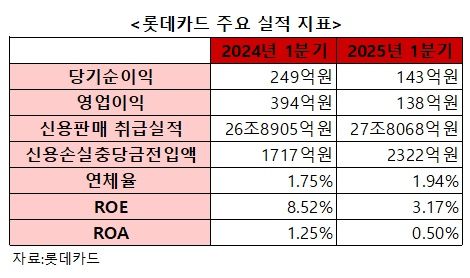 16일 카드업계에 따르면, 올해 1분기 롯데카드는 143억원의 당기순이익을 기록했다. 이는 전년 동기 대비 42.4% 감소한 수준이다. 올해 1분기 롯데카드가 실적이 크게 줄어들면서 8개 전업계 카드사 중 가장 낮은 수익성을 기록했다.
