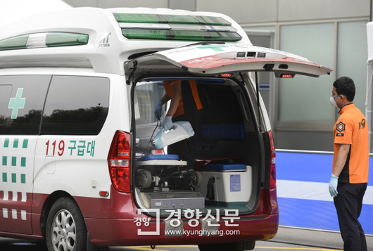 119구급대원들이 구급차를 소독하고 있다. 경향신문 자료사진 |