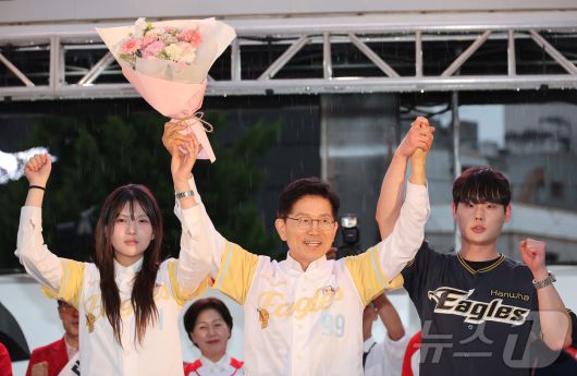 (대전=뉴스1) 이광호 기자 = 김문수 국민의힘 대통령 후보가 16일 오후 대전 중구 으능정이거리에서 가진 유세에서 한화이글스 유니폼을 선물한 대학생들과 함께 손을 맞잡고 있다. (공동취재) 2025.5.16/뉴스1pjh2035@news1.krCopyright ⓒ 뉴스1. All rights reserved. 무단 전재 및 재배포, AI학습 이용 금지.