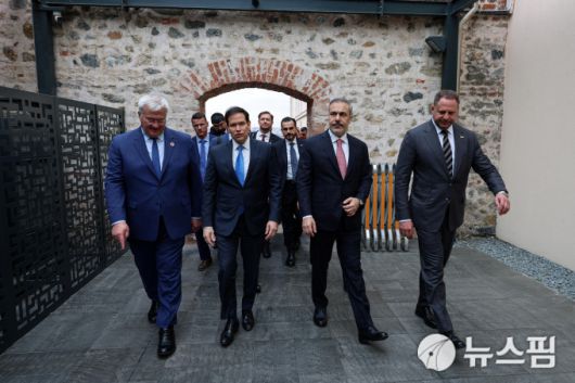 [이스탄불 로이터=뉴스핌] 장일현 특파원 = 16일(현지시간) 튀르키예 이스탄불에서 열린 우크라이나 전쟁 휴전 협상에 참석한 미국과 우크라이나, 튀르키예 정부 대표단이 담소를 나누며 함께 걷고 있다. 왼쪽부터 안드리 시비하 우크라이나 외무장관, 마코 루비오 미국 국무장관, 하칸 피단 튀르키예 외무장관, 안드리 예르막 우크라이나 대통령 비서실장. 2025.05.16. ihjang67@newspim.com |