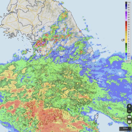 기상청은 당초 이날 오전만 해도 남쪽을 지나는 저기압의 영향으로 남부 지방에 비가 집중될 것으로 예측했다. 수도권 등 중부지방에는 대기불안정으로 인해 5~40㎜의 소나기가 내릴 것이라고 예보했다.