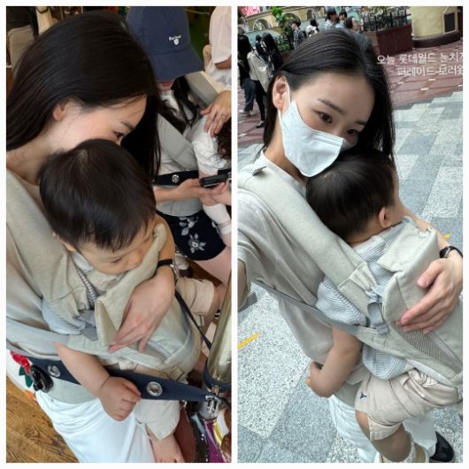 손연재가 롯데월드에서의 현실 육아 일상을 공개하며 아들 얼굴을 최초로 선보였다.사진=손연재 SNS |