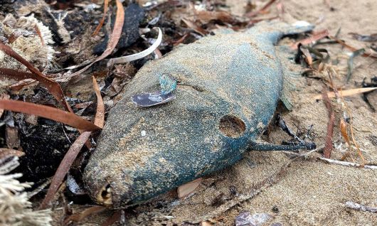 2025년 3월 29일에 오즈피쉬가 촬영하고 2025년 5월 15일에 공개한 사진. 남호주 빅터 항구에 떠밀려온 죽은 쥐치. AFP연합뉴스 |