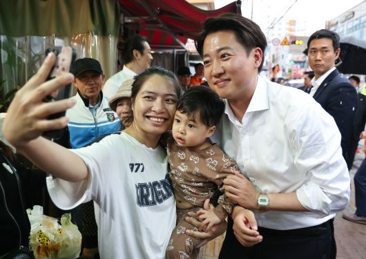 개혁신당 이준석 대선 후보가 16일 충청남도 천안중앙시장을 찾아 시민들과 셀카를 찍고 있다. /연합뉴스 |