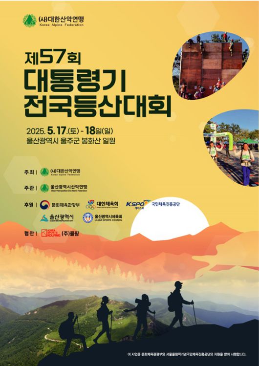 '제57회 대통령기 전국 등산대회'는 대한산악연맹이 주최하고, 울산광역시산악연맹이 주관하며, 문화체육관광부, 울산광역시, 대한체육회, 울주군, 울산광역시체육회, 국민체육진흥공단이 후원, 콜핑이 협찬한다. 이번 대회는 전국 13개 시·도연맹에서 110개 팀 360여명이 참가하는 가운데, 남녀 고등부·대학부·일반부·장년부 등 8개 부문으로 나뉘어 진행된다.