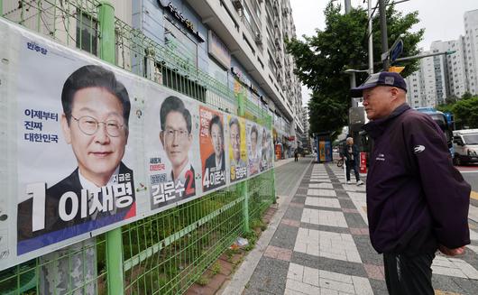 15일 한 유권자가 서울 양천구 목동2차 성원아파트 앞에 부착된 제21대 대통령선거 후보자 벽보를 살펴보고 있다. /뉴스1 |