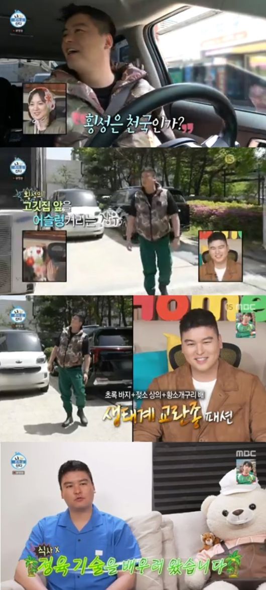 이장우는 초록바지에 젖소 상의, 황소개구리 같은 배로 생태계 교란종 패션을 선보여 웃음을 자아냈다.
