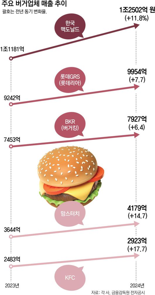 지난해 주요 버거 업체들은 대부분 좋은 실적을 냈다. 국내 1위인 한국맥도날드의 지난해 매출은 전년 대비 11.8% 증가한 1조2502억 원으로 역대 최대 매출을 경신했다. 영업이익은 117억 원으로 8년 만에 흑자 전환에 성공했다. 롯데리아를 운영하는 롯데GRS의 매출은 9954억 원으로 전년 동기 대비 7.7% 늘었다. 국내에서 버거킹을 운영하는 BKR도 매출 7927억 원으로 6.4% 성장했으며 맘스터치와 KFC도 지난해 매출이 각각 4179억 원, 2923억 원으로 전년 대비 14.7%, 17.7% 늘었다. KFC는 영업이익이 164억 원으로 전년 대비 469% 급증했다. BKR, 맘스터치, KFC도 지난해 역대 최대 매출 기록을 경신했다.