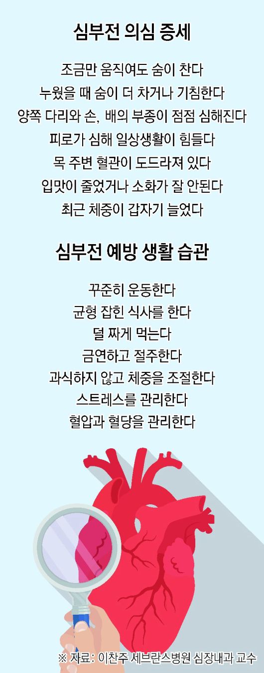 심부전을 예방하려면 혈압 외에도 관리해야 할 게 많다. 균형 잡힌 식사를 하되 과식을 피하면서 체중을 조절해야 한다. 유산소 운동은 매주 3회 이상은 하는 게 좋다. 담배는 끊어야 하고, 스트레스를 잘 다스려야 한다. 이 교수는 “이 예방법을 모르는 사람은 거의 없다. 문제는 실천에 있다. 아는 것보다 실천이 더 중요하다”고 말했다.