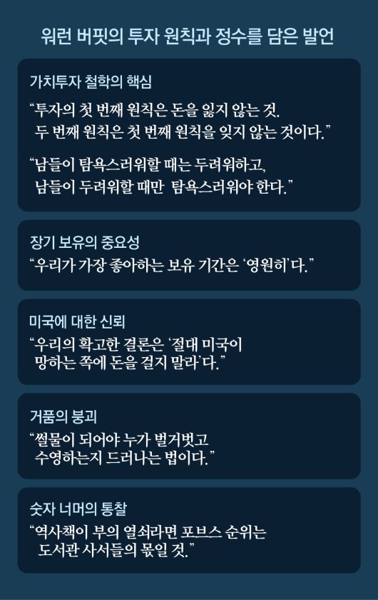 고평가된 시장에서는 현금 확보를, 시장 하락기에는 기회를 포착하라는 그의 투자 철학도 유명하다. 2008년 금융위기 당시 미국 기업 주식을 사라는 취지의 뉴욕타임스(NYT) 기고문을 통해 “시장이 탐욕스러울 때 두려워하고, 시장이 두려워할 때 탐욕스러워하라”는 자신의 철학을 밝힌 바 있다. 그는 당시 파산 직전의 골드만삭스, 뱅크오브아메리카에 투자해 향후 막대한 이득을 얻었다. 반대로 지난해 현금을 쌓아두기 시작하고 인공지능(AI) 기업 투자에 보수적인 태도로 일관해 시장에선 “버핏도 나이가 들었다”는 말이 나오기도 했다. 하지만 올해 초 기술주 조정기에 현금 보유량을 높였던 버핏의 전략이 빛을 발해 다시 주목을 받았다.