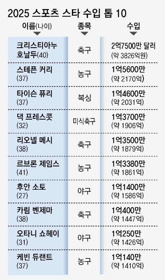 미국프로농구(NBA) 스타 스테픈 커리(37·골든스테이트 워리어스)가 1억5600만 달러(약 2170억 원)로 2위에 올랐다. 커리의 수입은 르브론 제임스(41·LA 레이커스)가 지난해 세운 NBA 최고액 1억2820만 달러를 넘어선 농구 선수 최고 기록이다. 3위는 올해 1월 은퇴를 선언한 영국 출신의 전 헤비급 복싱 세계 챔피언 타이슨 퓨리(1억4600만 달러)였다.