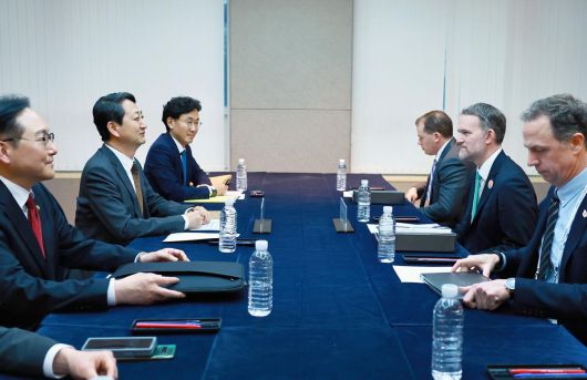 안덕근 산업통상자원부 장관(왼쪽에서 두 번째)과 제이미슨 그리어 미국 무역대표부(USTR) 대표(오른쪽에서 두 번째)가 16일 오후 제주 서귀포시 제주국제컨벤션센터(ICC)에서 양자회담을 진행하고 있다. 안 장관은 “다음 주부터 진행되는 기술 협의에서 어떤 이슈가 구체적으로 협상 테이블에 올라갈지 지켜봐야 할 것 같다”며 “국내에서는 농산물이나 구글 지도 등이 논의되고 있지만 ‘관세 협상에서 이걸 꼭 풀어야 한다’고 확정된 바는 없다”고 말했다. 산업통상자원부 제공 |