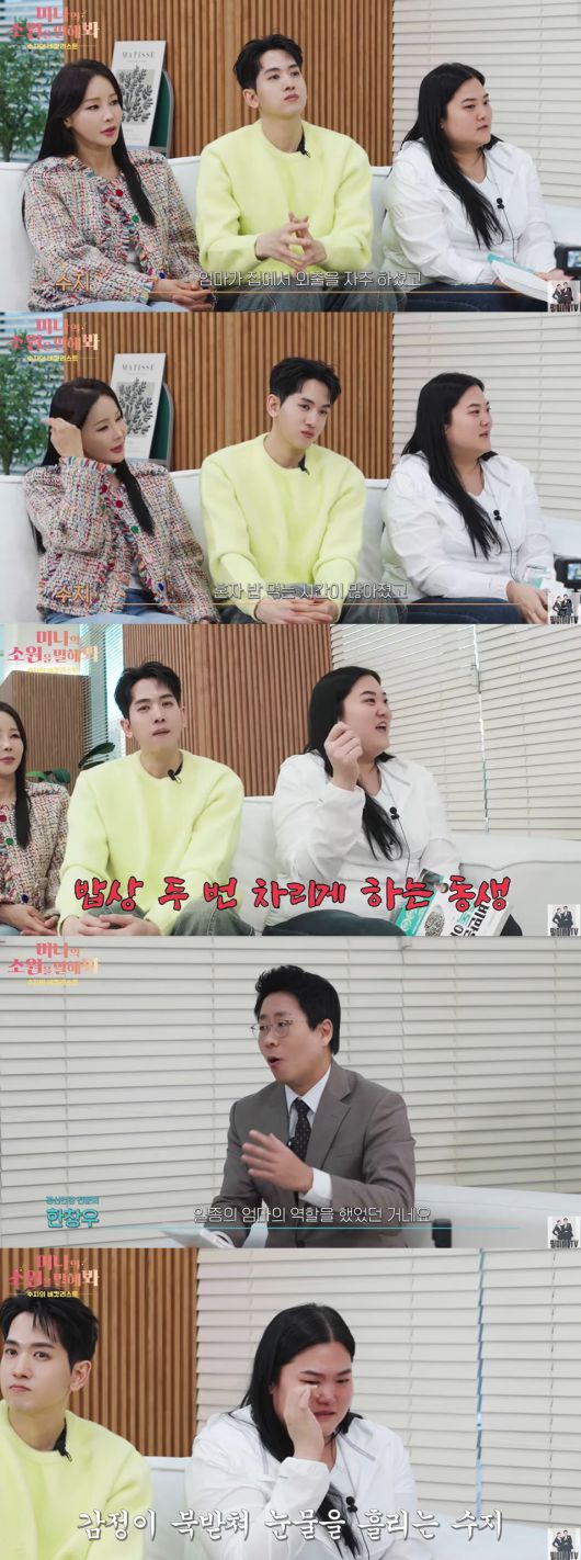 이에 전문의가 "엄마의 빈자리를 채우는 일종의 엄마의 역할을 했던 것"이라며 심리적 배경을 짚자 박수지는 감정이 북받친 듯 눈물을 보였다.