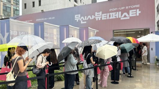 16일 서울 성동구 성수동2가에서 진행된 무신사 뷰티 페스타 팝업 스토어에 우산을 든 방문객들이 줄을 서고 있다. |