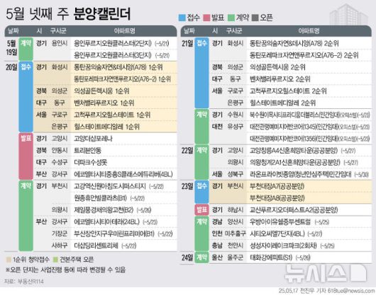 [서울=뉴시스]이연희 기자 = 부동산R114는 5월 넷째 주 전국 8개 단지 총 7623가구가 분양에 나선다고 17일 밝혔다. 이 중 일반분양은 4575가구 규모다.