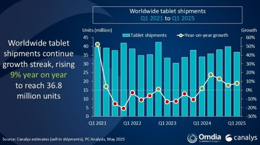 17일 시장조사업체 카날리스에 따르면 1분기 전 세계 태블릿 PC 출하량은 전년 동기 8.5% 증가한 3680만 대를 기록했다. 모든 지역에서 성장세가 나타났는데, 특히 중국 시장의 경우 출하량이 두 자릿수 성장한 것으로 나타났다.