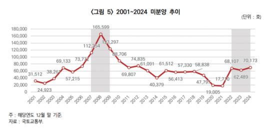 보고서에 따르면, 건설수주는 2008년 –15.5%에서 2023년 –18.9%로 감소 폭이 커졌다. 건축착공면적은 –31.7%로 더 크게 하락했다. 건설기성은 일시적 증가 후 2024년 –4.7%로 다시 하락세로 전환됐다. 미분양 주택은 2008년 47.5% 증가에서 2022년 284.6% 급증으로 각각 집계됐다.