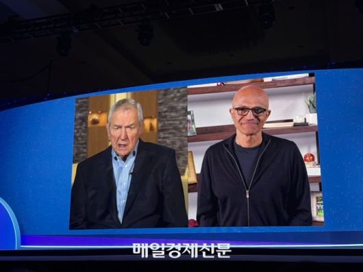 짐 굿나잇 SAS CEO(왼쪽)와 사티아 나델라 마이크로소프트(MS) CEO가 이달 8일(현지시간) 미국 플로리다주 올랜도에서 열린 ‘SAS 이노베이트 2025’ 행사에서 영상 대담을 진행하고 있는 모습. 매경DB |