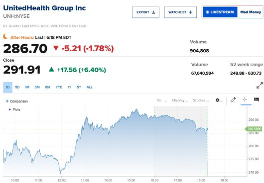 미국 최대 건강 보험사인 유나이티드헬스 주가가 이날 6.40% 상승 마감했다. 아트 호건 B.라일리웰스매니지먼트 수석 시장 전략가는 “단기적으로 과매도된 것으로 본 투자자들이 매수했다”고 분석했다.