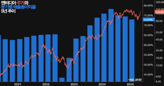 투자자 사이에서 마진 지표로 활용하는 엔비디아의 매출총이익률은 2025회계연도 1분기(작년 2~4월) 78%대에서 정점을 찍고 현재 73%까지 꾸준히 하락했다. 당시 엔비디아의 폭발적 성장세가 지속 불가능하다는 판단에 따라 관심이 마진으로 옮겨간 가운데 이익률의 하락은 주가에 크게 부담을 준 배경이 됐다. 올해 1월 딥시크 등장을 계기로 관련 우려는 더욱 증폭된 상태였다.