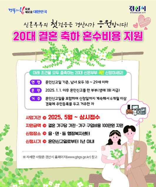 지원 대상은 혼인신고일 기준, 부부 모두 18세부터 29세 이하이며 경산에 거주하는 신혼부부로, 혼인신고일을 포함해 신청일까지 계속해서 6개월 이상 경북에 주민등록을 두고 거주한 경우다.