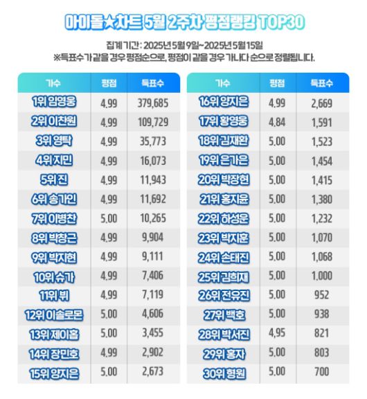 최근 아이돌차트는 5월 9일부터 5월 15일까지 집계된 평점랭킹에서 임영웅이 37만 9,685표로 최다득표자에 올랐다고 밝혔다.