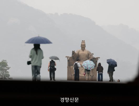 시민들이 봄비가 내린 16일 서울 광화문광장을 지나가고 있다. 강윤중 기자 |