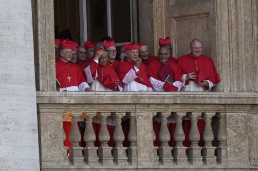 지난 8일(현지시각) 바티칸 성 베드로 대성당의 발코니 중 한 곳에서 새 교황 레오 14세를 선출한 추기경들이 환한 표정으로 광장을 내려다보고 있다. AP 연합뉴스 |