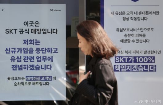 [서울=뉴시스] 김명년 기자 = 14일 오전 서울 시내 한 SK텔레콤 매장에 유심보호서비스 관련 안내문이 게시돼 있다. SK텔레콤은 해외 여행 중이거나 해외 거주자 등 현재 유심보호서비스에 가입돼 있지 않은 고객들을 대상으로 지난 12일부터 유심보호서비스에 순차적으로 자동 가입을 진행하고 있다. 2025.05.14. kmn@newsis.com /사진= |