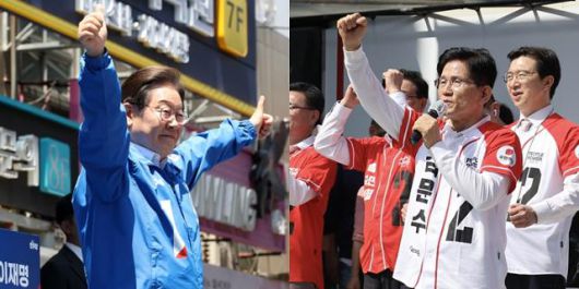이재명(왼쪽 사진) 더불어민주당 대선 후보가 14일 부산 서면 쥬디스태화 인근에서 열린 부산 유세에 참석해 시민들에게 인사하고 있다. 오른쪽은 같은 날 경남 진주시 진주대로에서 지지를 호소하고 있는 김문수 국민의힘 후보. 부산=고영권·진주=하상윤 기자 |