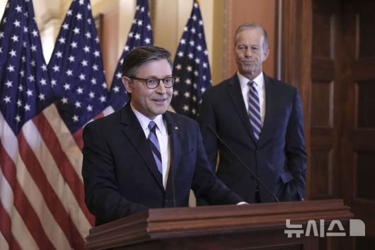[워싱턴=AP/뉴시스]마이크 존슨 미 하원의장(왼쪽)이 지난 4월10일 존 손 상원 공화당 원내총무와 함께 도널드 트럼프 대통령이 "아름다운 법안"이라고 부른 세금 감면 및 지출 삭감 패키지에 대한 표결을 앞두고 기자들에게 패키지에 대해 설명하고 있다. 공화당 강경파 하원의원 5명이 16일(현지시각) 하원 예산위원회에서 도널드 트럼프 미 대통령의 세금 감면 및 지출 삭감 패키지를 부결시켰다. 2025.05.17. |