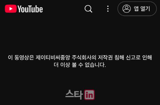 1화 시청 링크에 접속하면 ‘이 동영상은 제이티비씨중앙 주식회사의 저작권 침해 신고로 인해 더 이상 볼 수 없습니다’라는 안내 문구가 뜬다. 유튜브가 저작권자의 신고를 받아들이고 조치를 취한 것.