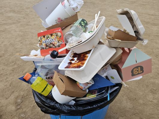 큰 쓰레기통 안에 일회용 쓰레기들. 각종 음식물과 뒤섞인 채 산처럼 쌓여 있다. 갈 곳 잃은 쓰레기들은 그대로 통 밖으로 밀려나 바닥에 떨어진다.