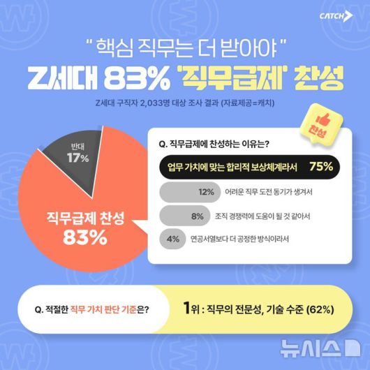 17일 채용 플랫폼 캐치가 Z세대 구직자 2033명을 대상으로 직무급제에 대한 의견을 물어본 결과, 83%가 찬성하는 것으로 나타났다. 반대하는 비중은 17%였다.