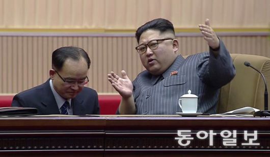 2021년 1월 노동당 8차 대회 주석단에서 김정은에게 무릎을 꿇고 보고를 하는 조용원 노동당 비서. 북한의 각종 대회 때마다 이런 장면은 일상처럼 보도가 된다. 동아일보 DB |