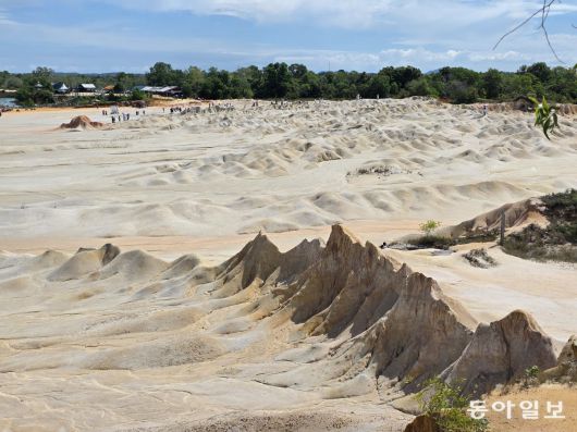 티모시 샬라메 주연의 영화 ‘듄’에 나오는 것처럼 모래바람이 끊임없이 불어대는 사막은 아니지만, 외계의 행성에 와 있는 듯한 낯선 풍경이 인상적이다. 소금사막은 때로는 경주의 고분군처럼 부드러운 곡선으로 울퉁불퉁이어지기도 하고, 불꽃처럼 뾰족뾰족 세워져 있기도 한다. 바람이 부는 모래 언덕 위에 하늘하늘 펼쳐지는 흰색 스카프만 하고 서 있으면 누구나 모델이 된다.