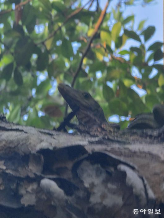 앞서 가던 보트에서 가이드가 배를 멈추더니 손가락으로 나무 위를 가리킨다. 가지 위에 왕도마뱀 한 마리가 앉아 있다. 맹그로브 왕도마뱀은 크기가 1.5m까지 자라며, 헤엄도 치고, 나무에 기어오를 수도 있다고 한다.