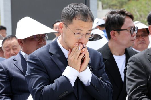 5·18민주화운동 45주년을 하루 앞둔 17일 국민의힘을 탈당한 무소속 김상욱 국회의원이 광주 북구 운정동 국립5·18민주묘지에서 열린 5·18추모제에서 추모공연을 보고 눈문을 닦고 있다. 연합뉴스 |