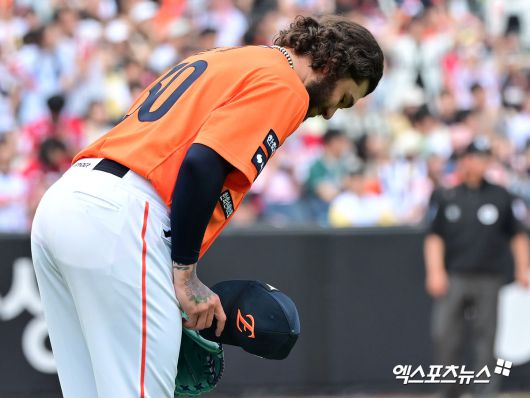 (엑스포츠뉴스 대전, 김한준 기자) 17일 오후 대전 한화생명 볼파크에서 열린 '2025 신한 SOL Bank KBO리그' SSG 랜더스와 한화 이글스의 더블헤더 1차전 경기, 4회초 1사 한화 폰세가 SSG 최정의 타구를 처리한 황영묵을 향해 감사 인사를 하고 있다.김한준 기자 kowel@xportsnews.com