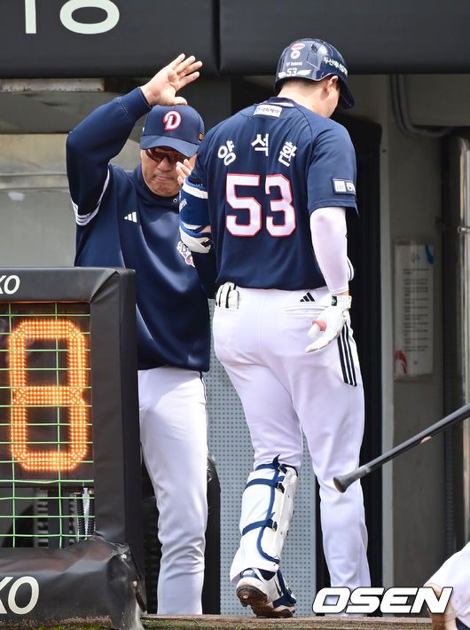 4회초 1사 두산 양석환이 솔로 홈런을 날린 뒤 더그아웃에서 이승엽 감독과 하이파이브를 하고 있다. 2025.05.17 / ksl0919@osen.co.kr