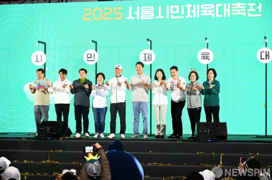 [서울=뉴스핌] 양윤모 기자 = 오세훈 서울시장이 17일 오전 잠실실내체육관에서 열린 '서울시민체육대축전'에서 참석한 오언석 도봉구청장등 참석자들과 함께 축하 세리머니를 하고 있다. 서울시민체육대축전은 5월 17일(토)~18일(일) 양일간 잠실실내체육관 일대에서 진행되는 서울 최대 규모 시민참여형 생활체육축제다. 올해는 9,000여 명의 시민이 참여해 파크골프·풋살 등 동호인 10개 종목과 스포츠 스태킹·농구 슈팅 등 시민참여 10개 종목별 경기를 진행한다. [사진=서울시청] 2025.05.17 yym58@newspim.com