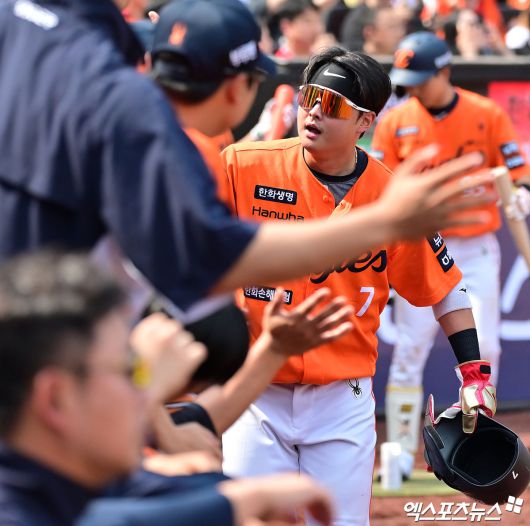 (엑스포츠뉴스 대전, 김한준 기자) 17일 오후 대전 한화생명 볼파크에서 열린 '2025 신한 SOL Bank KBO리그' SSG 랜더스와 한화 이글스의 더블헤더 1차전 경기, 4회말 1사 1루 한화 이도윤이 최재훈의 1타점 2루타때 득점에 성공하고 있다.김한준 기자 kowel@xportsnews.com