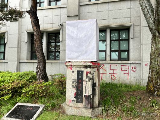 16일 오전 동덕여대 캠퍼스. 남녀공학 전환에 반대해 지난 11월 벌어진 교내 점거 농성 6개월이 지난 현재도, 동덕여대 설립자 조용각 전 이사장 흉상에는 붉은 래커와 페인트 자국이 그대로 남아 있다. 윤성현 수습기자. |